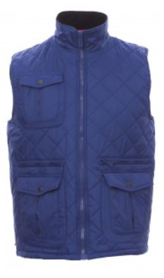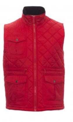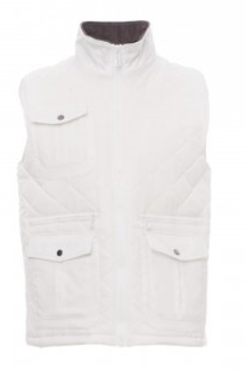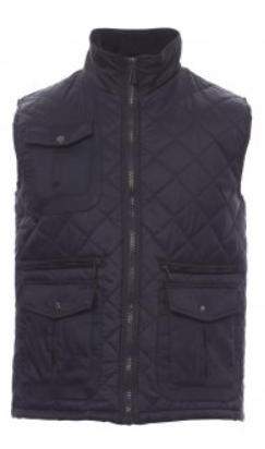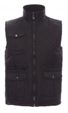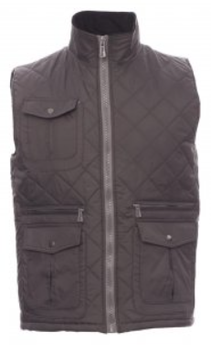 Chaleco acolchado para hombre, cremallera de plástico de 8 mm con tirador metálico, ventilaciones laterales con botón, cinco bolsillos exteriores, dos con LOCK SYSTEM. Banda acolchada de pana elástica en la parte interior del cuello, un bolsillo interior.