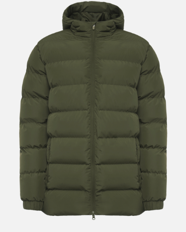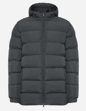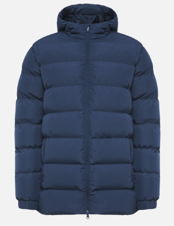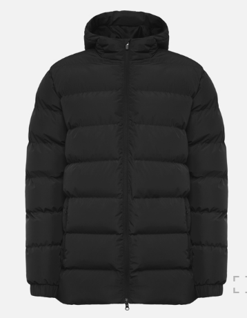 Parka acolchada repelente al agua con capucha fija y visera. Cremallera frontal al tono y tirador de doble dirección. Protector de barbilla del mismo tejido. Puños elásticos. Bolsillos laterales con cremalleras al tono. Bolsillo interior en pecho izquierdo. Acceso interior para reprocesos.