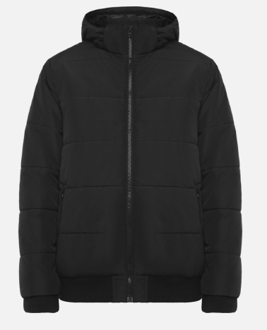 Chaqueta acolchada repelente al agua. Capucha extraíble con ajustadores. Cremallera frontal al tono. Protector de barbilla del mismo tejido. Puños y bajo en canalé 1×1. Bolsillos laterales con cremalleras al tono. Accesos externos en pecho izquierdo y espalda con cremallera invisible para reprocesos.