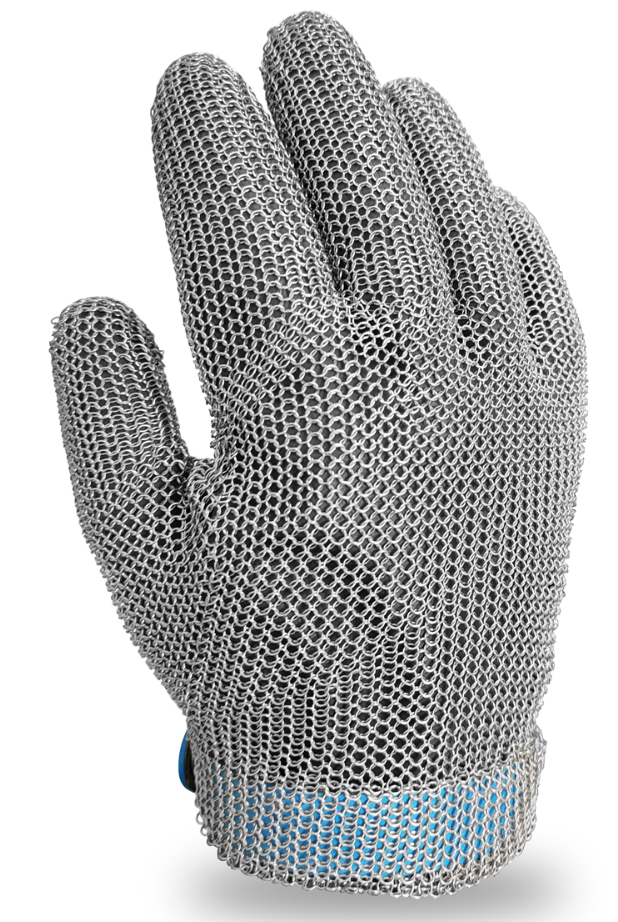 Guante malla metálica de acero inoxidable. Manulatex GCM Aplicaciones: Protección frente a los cortes y los golpes ocasionados por cuchillos u otras herramientas de corte manuales. Trabajos en industria cárnica y matadero (deshuesado y despiece), restauración (corte de carne, pescado o apertura de marisco), industria del plástico, cuero, textil o papel (operaciones de corte/manipulado piezas cortantes), construcción (operaciones de revestimiento, alicatado..).