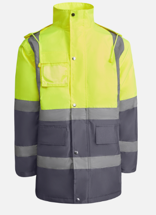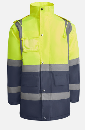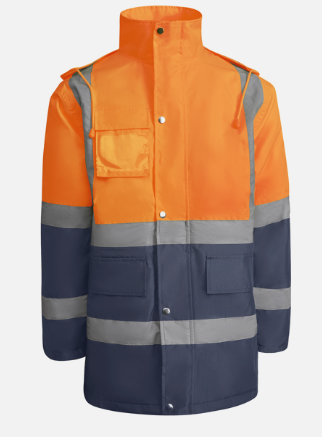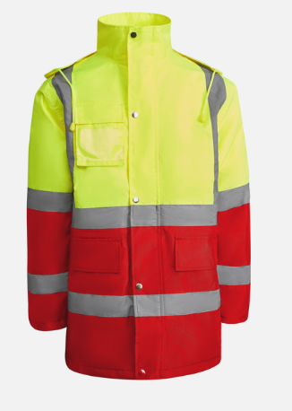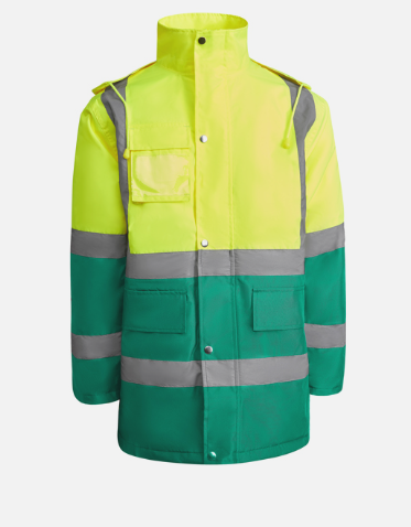 Parka acolchada de alta visibilidad. ·Tejido impermeable con costuras termoselladas, resistente al agua y al viento. ·Capucha enrollable. ·Cremallera frontal de doble dirección y tapeta con botones de cobre a presión. ·Puños internos ajustables para el frío. ·Dos bandas reflectantes horizontales y dos verticales en cuerpo. ·Dos bandas reflectantes en las mangas. ·Dos bolsillos laterales con tapeta. ·Bolsillo en pecho con tapeta y tarjetero de identificación. ·Bolsillo interior con cremallera. ·Acceso en espalda para reprocesos. ·Opciones de color en liso y combinado. ·Etiquetado Roly WRK exterior. ·Ciclos de lavado: x25