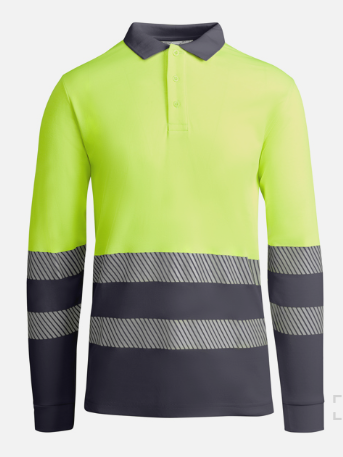 Polo manga larga alta visibilidad transpirable. ·Mezcla poliéster algodón tacto algodón. ·Dos bandas segmentadas en el cuerpo y dos en mangas. ·Puño y cuello en canalé 1×1. ·Tapeta con 3 botones a contraste. ·Bolsillo opcional. ·Cubrecosturas en el cuello. ·Opciones de color en liso y combinado. ·Etiquetado Roly WRK exterior. ·Ciclos de lavado: x25