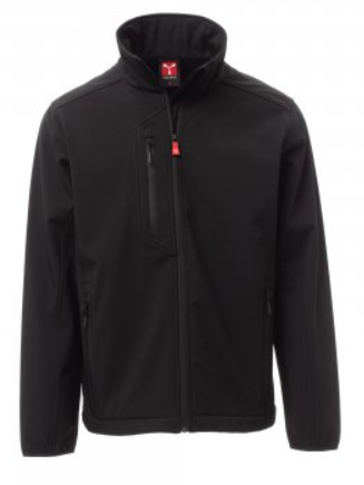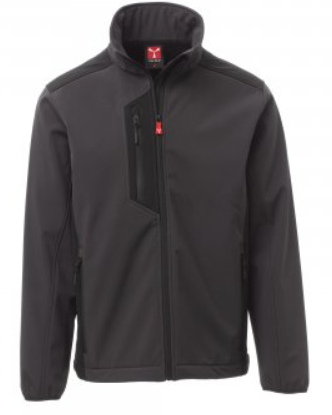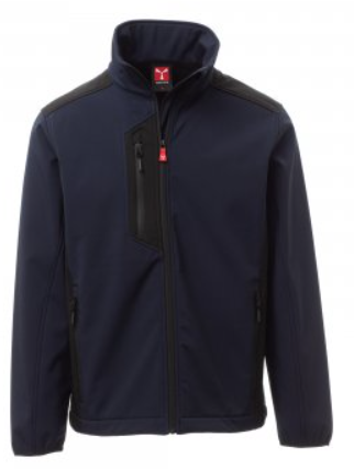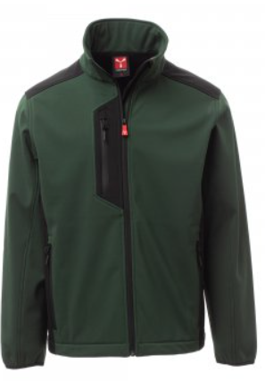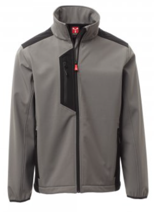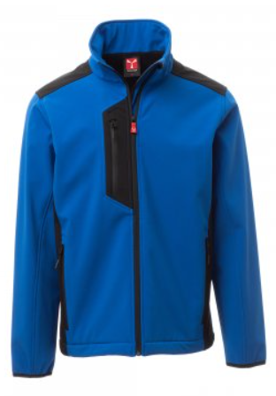WP 8000 mm H₂O, WVT 5000 g/m² 24h. Soft-shell de tres capas, de hombre, bicolor, cierre de cremallera con cursor de metal con sistema de bloqueo semiautomático y tirador personalizado. Puños con ribete elástico Dos bolsillos laterales con cremallera, un bolsillo en el pecho con cremallera recubierta. Detalle retrorreflectante en el canesú trasero. Bajo ajustable con topes personalizados.